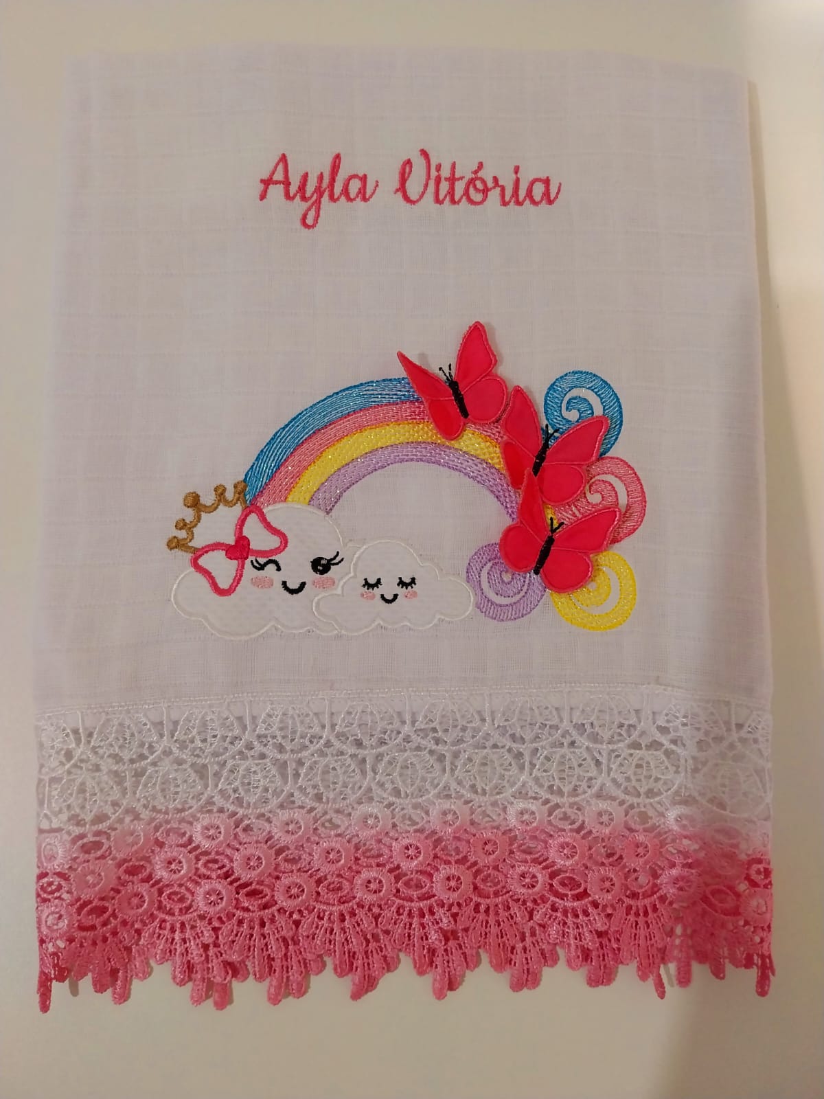 Fralda grande – Nuvem e Arco-Íris com borboletas 3D – Rosa
